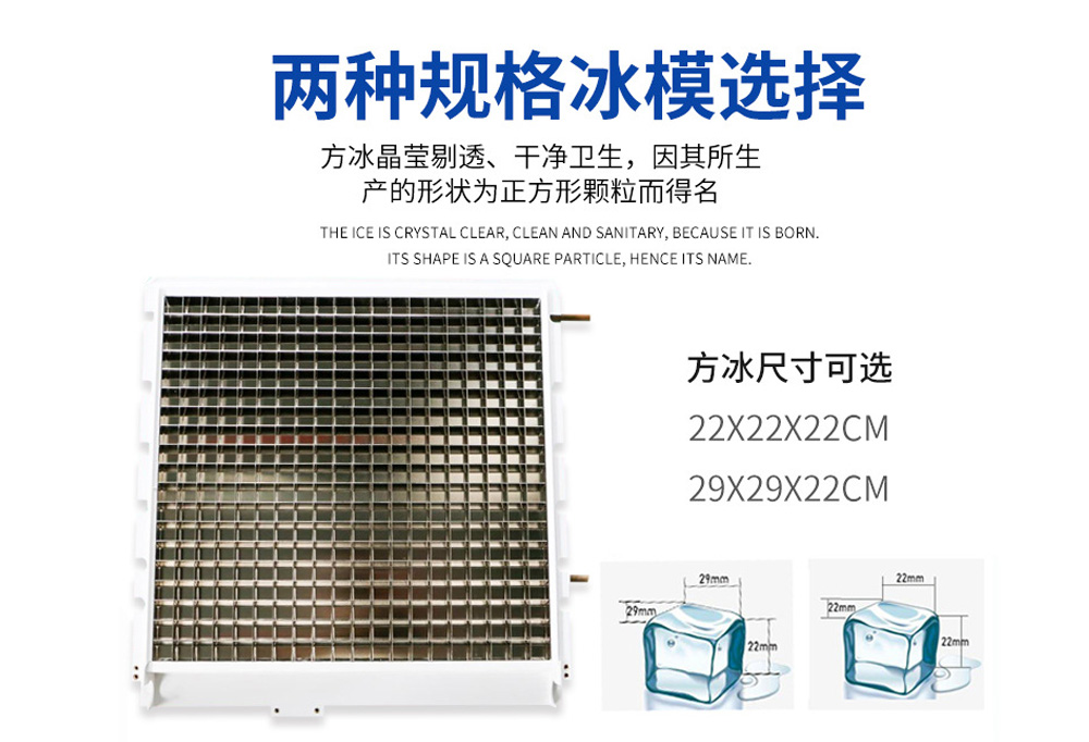 方冰機為制冰機的一種。因其所生產(chǎn)冰塊形狀為正方形顆粒冰而得名,有多種尺寸可供選擇,冰的外尺寸有:22x22x22mm;29x29x22mm等。所生產(chǎn)冰塊名稱為方冰(顆粒冰),接觸面積為市場現(xiàn)有冰種類中較小,抗融性較好,適合飲用品調(diào)制、裝飾、食物冰藏保鮮等等,故大多為可食用冰。方冰遍布于賓館、酒店、酒吧、宴會廳、西餐廳、快餐店、便利店以及冷飲店,KTV、西式速食、早餐店、啤酒屋等需要冰塊的地方。冰塊晶瑩剔透,干凈衛(wèi)生;